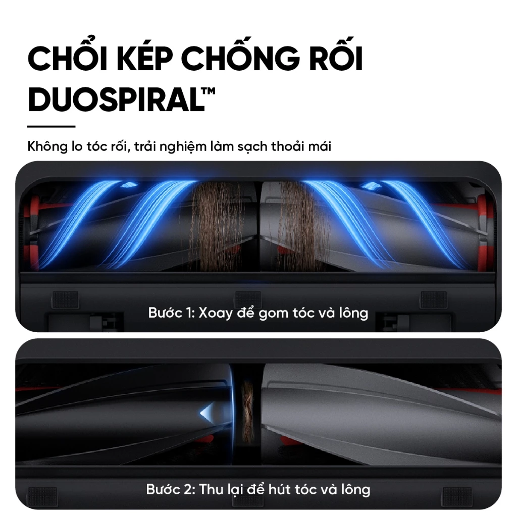 - Chổi đôi DuoSpiral™ chống rối tóc, tự động gỡ rối và giảm tần suất bảo trì.